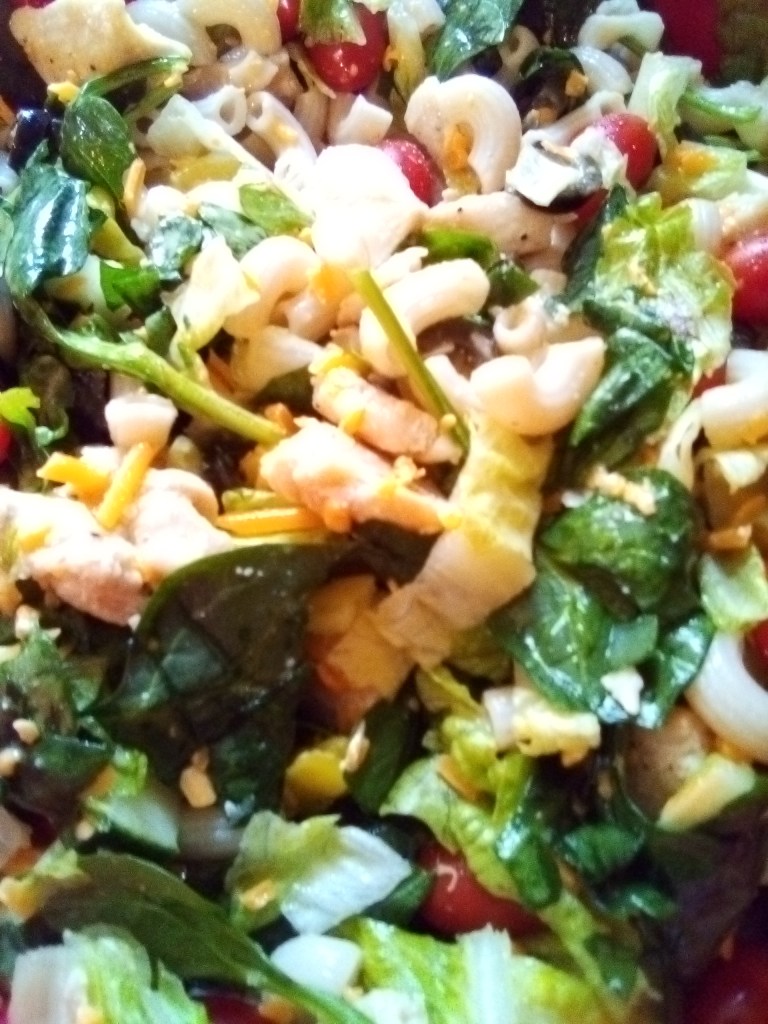 Mix all your ingredients together in a large bowl. Use a circular blade cutter to chop your salad further. If you don’t have one, you can just chop up your ingredients on your cutting board before adding them to the large salad bowl. When everything is chopped to your satisfaction, add the cheese and the tomatoes. Add the chicken and rinsed and cooled pasta and toss well. Serve onto plates and top with your favorite dressing. Yum!!!