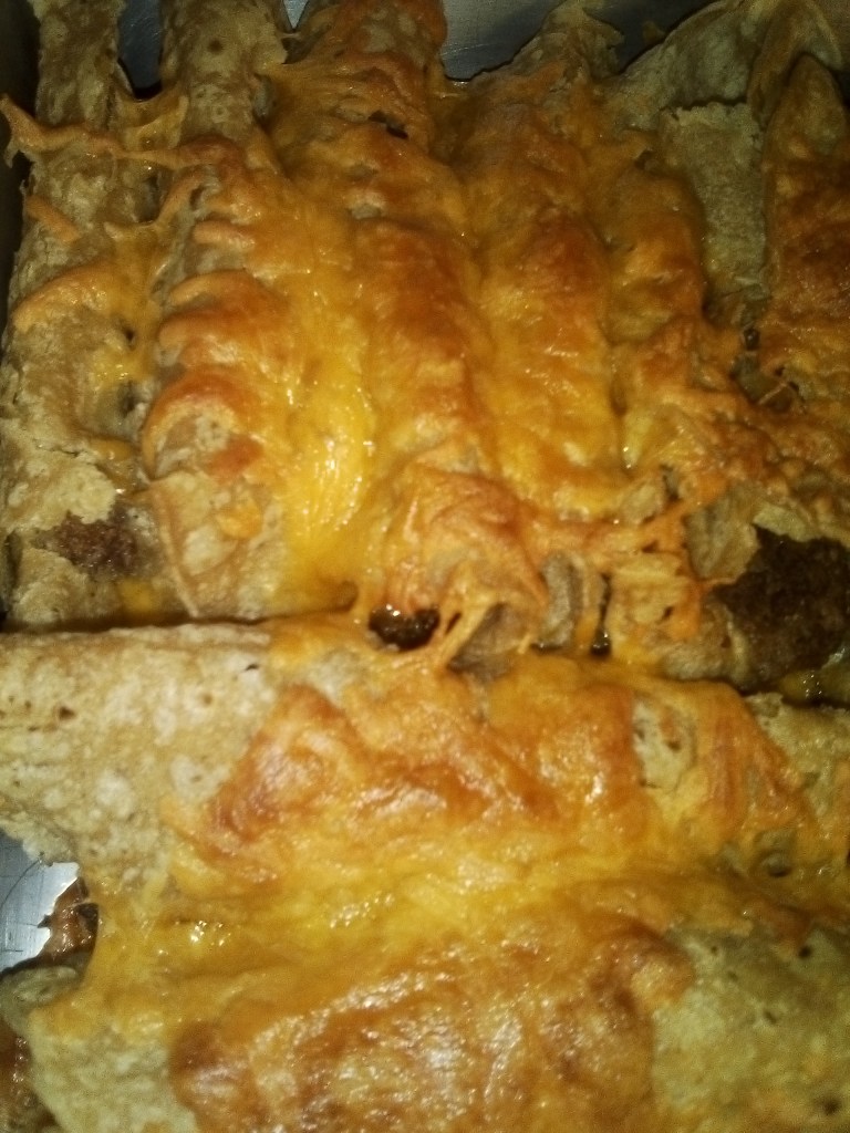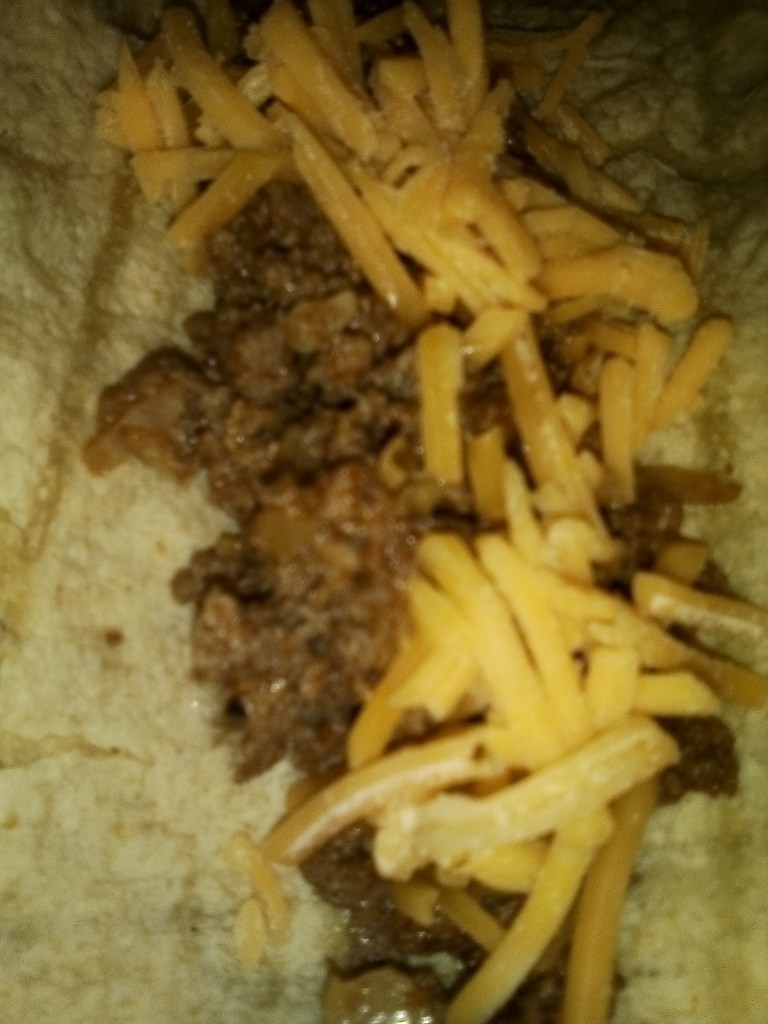 Preheat your oven to 350° F. Take each tortilla, one at a time and fill with meat mixture (not too full, as you want them to roll!) On top of the meat put in a good sprinkle of cheese. Roll the taquito and place it at the end of your greased 9″ x 13″ pan, using your assistant’s ultra clean hands to hold it in place. Continue with the remainder of the tortillas. We got 12 across the long way of the pan and then 6 in 2 rows the opposite way across the bottom.