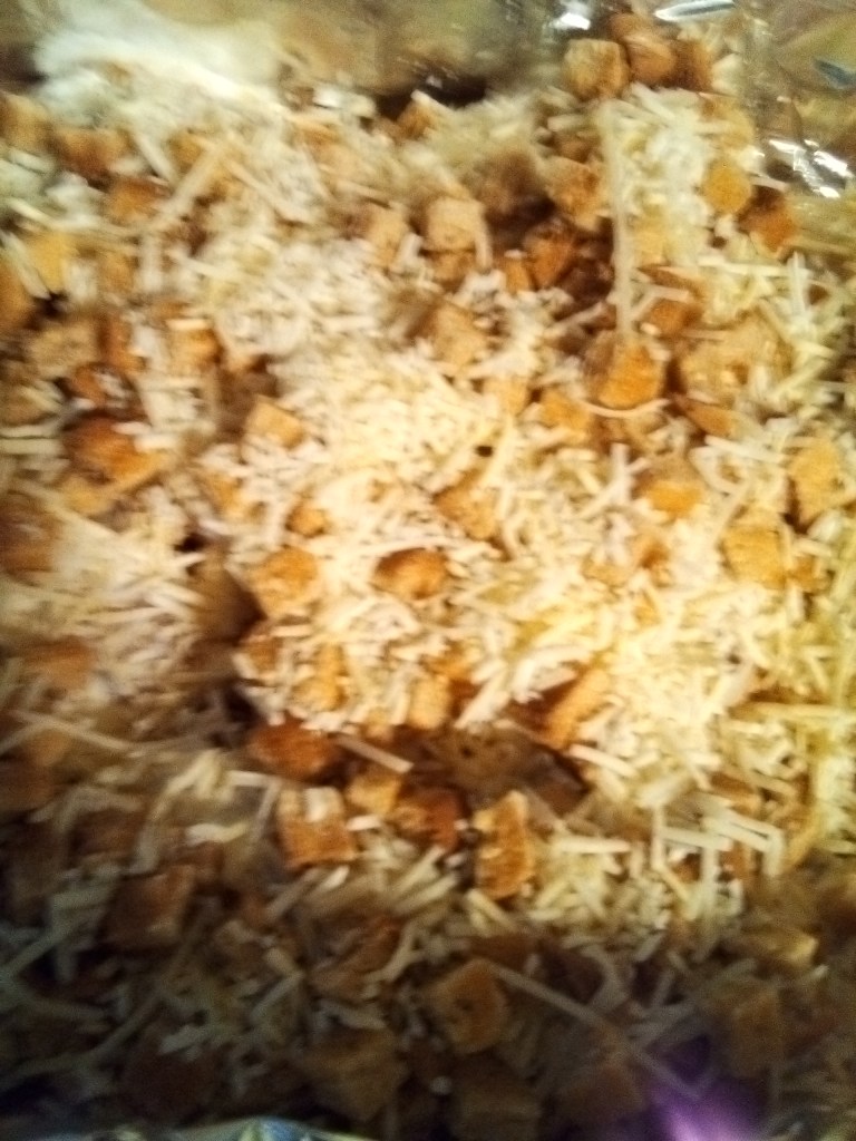 Preheat your oven to 350° F. Line your 9″ x 13″ pan with foil and spray with your non-stick cooking spray. Place chicken breasts in your prepared pan. Evenly distribute the ceasar dressing over the tops of the chicken. Add breadcrumbs (or in our case, bread cubes!) Top with parmesan cheese. Bake for about 1 hour (mine took 55 minutes!) or until a thermometer inserted reads 165° F. Serves 10, or 5 with leftovers for tomorrow’s lunch!