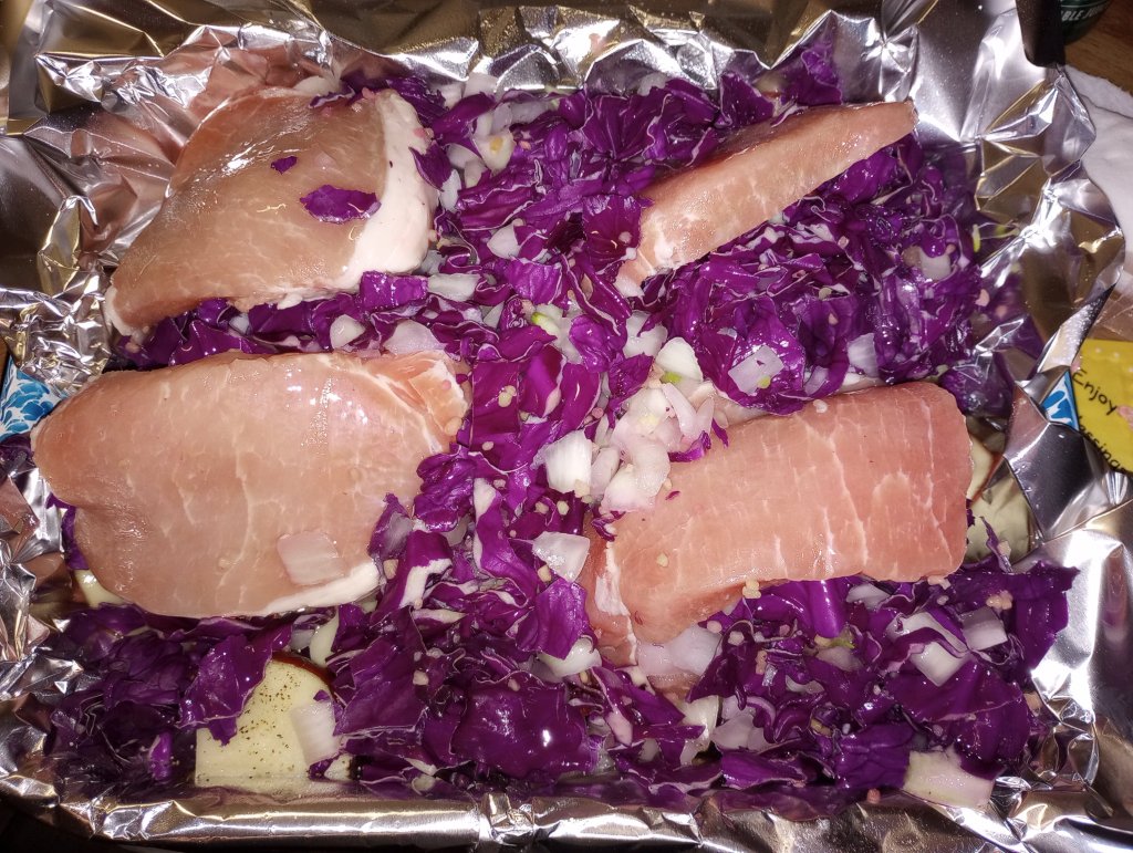 The Night of Dinner: Arrange your salt and pepper sprinkled potatoes in your 9″ x 13″ pan. Drizzle the oil over the potatoes. Slice the pork chops in half, flat wise, while leaving two sides still attached. Do the same to the other three pork chops. Stuff these with as much of the cabbage, onion, garlic mixture as you can fit. Salt and pepper to taste. Put the remainder of the mixture over your potato wedges.