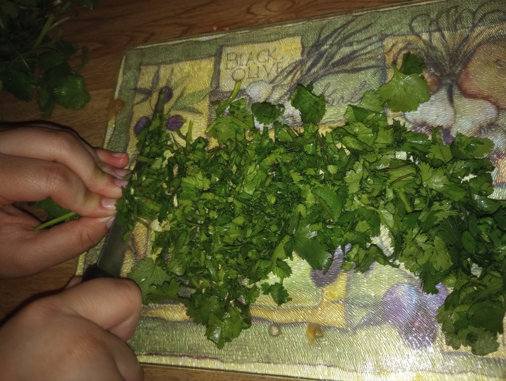 Children #’s 3 & 4 chopped the cilantro finely and added it to the bowl. As I said above, if I were to make this again, I would use about half of the bundle of cilantro, as it was a bit much, but since we like the herb, it was fine.